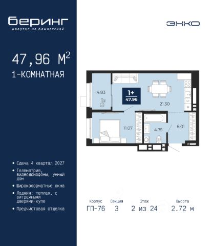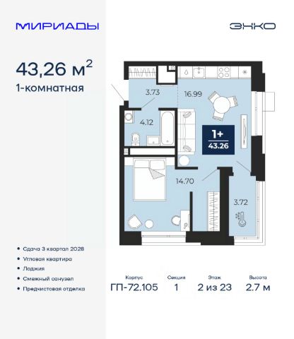 Однокомнатная квартира от застройщика с предчистовой отделкой в ЖК "Мириады" на 2 этаже. Общая площадь: 41.45 кв.м., жилая: 12.26 кв.м., площадь просторной кухни-столовой: 17.34 кв.м. Все окна выходят на одну сторону. В квартире один балкон, один совмещенный санузел. Высота потолков 2.7 м. Дом монолитный, двухподъездный, переменной этажности, от 14 до 16 этажей. Квартира находится во 2-й секции высотой 16 этажей в корпусе ГП-72.107. На этаже 10 квартир. В подъезде 1 пассажирский и 1 грузовой лифт. Окончание строительства - 3 квартал 2028 года. Оформление сделки по договору долевого участия. Вселенная бесконечных историй. Ранее невиданный Тюмени масштаб: территория 240 гектаров и 1 650 000 м² застройки. Мириады это город масштабных перемен и больших возможностей. Город зеленых рощ и зеркальных озер. Город для работы, учебы и развлечений. Город для детей и их родителей. Город для всех и каждого. Проект расположен в районе Мыс рядом с ТРЦ "Тюмень Сити Молл" в границах улицы Тимофея Чаркова, Тобольского тракта и объездной дороги. Срок полного освоения территории - до 2034 года. #27oZuv