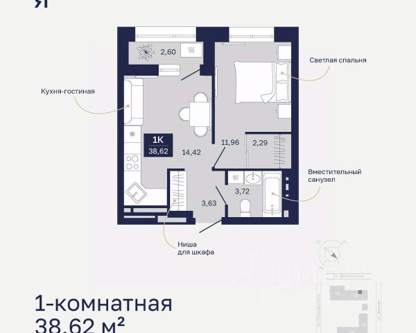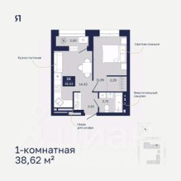 Квартира с кухней-гостиной и двумя спальнями в Доме у озера. Особенности планировки: предчистовая отделка.