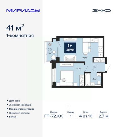 Просторная 1-комн. квартира с предчистовой отделкой в Кварталы "На Минской" на 4 этаже. Общая площадь: 54.34 кв.м., жилая: 11 кв.м., площадь просторной кухни-гостиной: 28.6 кв.м. Все окна выходят на одну сторону. В квартире одна лоджия, один совмещенный санузел. Высота потолков 2.7 м. Дом монолитный, многоподъездный, переменной этажности, от 7 до 16 этажей. Квартира находится в 1-й секции высотой 16 этажей в корпусе 1. На этаже 8 квартир. В подъезде 2 пассажирских лифта. Окончание строительства - 4 квартал 2026 года. Оформление сделки по договору долевого участия. Квартира с кухней-гостиной и одной спальней в кварталах "На Минской". Особенности планировки: предчистовая отделка. квартиры в нашей базе: МНС01-Ж1.4.5. В сердце города Кварталы "На Минской" находятся в самом центре. За десять минут можно дойти до площади 400-летия Тюмени и Большого Драматического театра, Тюменского индустриального и медицинского университетов, спортивного комплекса "Строймаш", ТРЦ "Гудвин" и "Премьер", Тюменского технопарка. Поблизости много детских садов, школ и поликлиник. Пространство разного опыта Создавая кварталы "На Минской" мы вдохновлялись Хакскими дворами в Берлине и улицей Давида Агмашенебели в Тбилиси. И первые и вторая — яркие разнообразные пространства, сформированные прогрессивными архитекторами и притягивающие городских интеллектуалов. Престижная недвижимость здесь соседствует с барами, ресторанами, креативными кластерами и бюро, дизайнерскими лавками. Полезные улицы Кварталы "На Минской" свяжет сеть променадов, автомобильных проездов и велодорожек. Уличный фронт проекта мы сформируем с помощью аллейной посадки деревьев. Они создадут тень для ресторанов и кафе на первых этажах, визуально отделят проезжую и пешеходную части, снизят объём пыли и уровень шума. Мы реализуем проект в районе с развитой базовой инфраструктурой. И поэтому тщательно подошли к программированию коммерции, посчитав, что её основная задача — "закрывать" более высокие потребности жителей. Здесь может появиться пекарня с вкусными круассанами, турагентство на случай, если захочется перезимовать в Сочи, массажный кабинет, ресторан, когда надоело есть дома и многое другое. #ZWfuVc