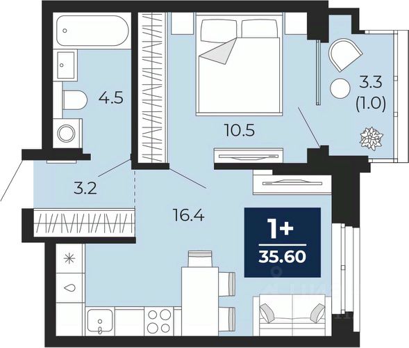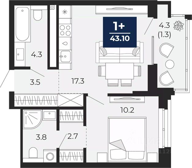 Просторная 1-комн. квартира с предчистовой отделкой в ЖК "Республики 205" на 4 этаже. Общая площадь: 45.87 кв.м., жилая: 12.1 кв.м., площадь просторной кухни-гостиной: 20.8 кв.м. Все окна выходят на одну сторону. В квартире один балкон, один совмещенный санузел. Высота потолков 2.7 м.