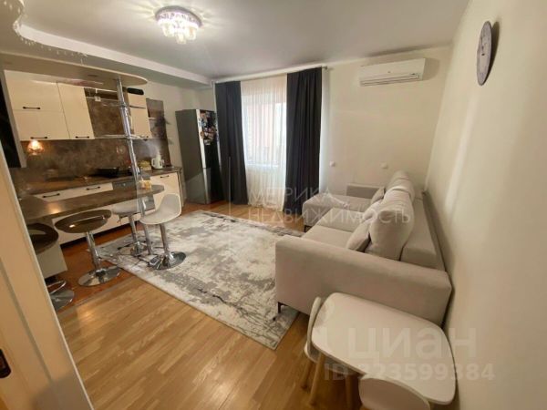 B квартире евроремонт, с использованием современных технологий из качественных материалов. На полу в комнате и кухне качественный ламинат. Пол возле кухонного гарнитура и в коридоре выложен плиткой. Потолок выровнен и покрашен. На стенах в кухне наклеены обои, в комнате стены выравнены и покрашены. Санузел в кафеле и с теплым полом. Балкон застеклен. На балконе встроенный шкаф для хранения. Кухня разделена условно на две зоны: кухня-столовая с барной стойкой и зона отдыха с мягким диваном. Установлены межкомнатные двери.