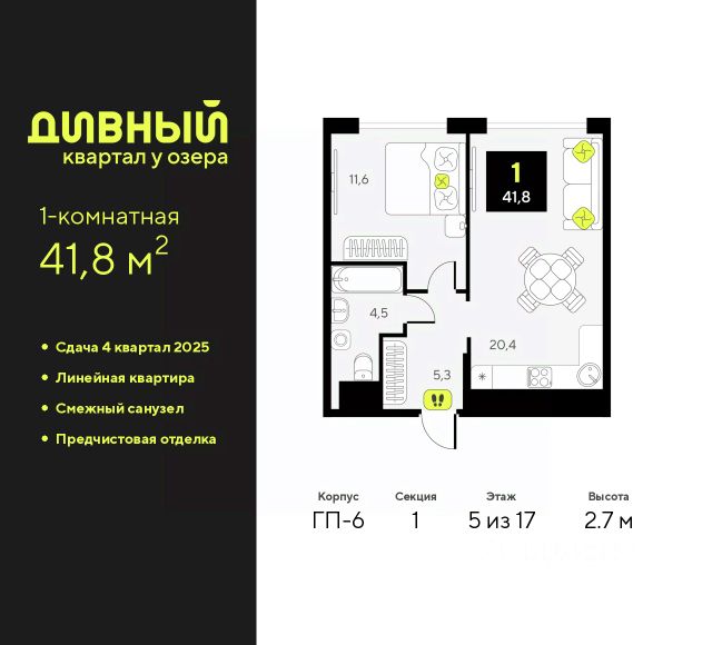 Квартира в счёт первоначального взноса по программе обмена. Звоните, наши менеджеры вам все расскажут! Продается 1-комн. квартира от застройщика с предчистовой отделкой в ЖК "Дом у озера" на 5 этаже. Общая площадь: 43.5 кв.м., жилая: 11.2 кв.м., площадь просторной кухни-гостиной: 17.4 кв.м. Все окна выходят на одну сторону. В квартире одна лоджия, один совмещенный санузел. Высота потолков 2.7 м. Дом монолитный, многоподъездный, переменной этажности, от 2 до 8 этажей. Квартира находится в 5-й секции высотой 7 этажей в корпусе 3. На этаже 6 квартир. В подъезде 1 грузовой лифт. Окончание строительства - 2 квартал 2027 года. Оформление сделки по договору долевого участия. Квартира с кухней-гостиной и одной спальней в Доме у озера. Особенности планировки: балкон, вид во двор, предчистовая отделка. квартиры в нашей базе: ДМУ03-Ж5.5.5. "Дом у озера" является продолжением "Европейского квартала". Он расположен в центре заречного района города. В 2030 году здесь появится квартал, состоящий из урбан-вилл, таунхаусов, секционных домов и башни. Вокруг уже сформирована необходимая инфраструктура: детские сады, школы, спортивный комплекс, продуктовые магазины, аптеки, кофейни, рестораны и салоны красоты. Путь до центра города занимает 7 минут на машине. Озеро Тихое — ценный рекреационный ресурс. Брусника вернула ему прежнее значение и сделала новой точкой притяжения для жителей микрорайона. Ключевым элементом концепции благоустройства стала вода. В каждой части квартала архитекторы нашли для нее свою форму. Вдоль пешеходных улиц разместили искусственные ручьи, на центральной площади — фонтан и дождевые сады. Основная точка притяжения жителей — озеро и выходящий на его сторону променад. Здесь мы организуем смотровые площадки и расположим летние террасы кафе и ресторанов. Тесную связь застройки с ландшафтом обеспечивает многоуровневое озеленение. Буфер из деревьев и кустарников по периметру квартала превращается в естественный ветрозащитный экран. Такое решение позволяет создать на территории "Дома у озера" комфортный микроклимат. Подъезды "Дома у озера" с прозрачными входными группами и большими лифтами. Для мест общего пользования архитекторы разработали новую интерьерную коллекцию, вдохновленную эклектичными восточными мотивами. В отделке сочетаются коричневый, желтый и белый цвета, повторяющие колористические решения фасадов. Декоративные перегородки, установленные в лобби, напоминают машрабию — элемент арабской архитектуры в виде узорной решетки. За счет мягкой мебели, многоуровневого освещения теплых оттенков и предметов декора (например, зеркал и картин) холлы воспринимаются как продолжение квартиры. #2SD8me
