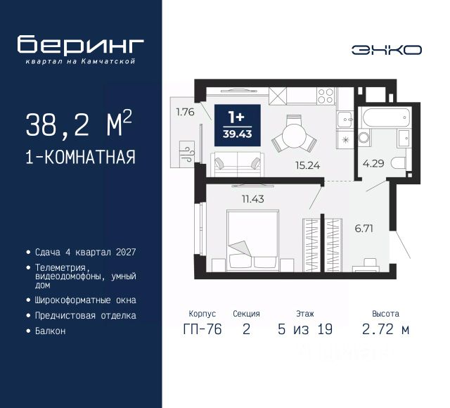Просторная однокомнатная квартира с предчистовой отделкой в ЖК "Беринг" на 5 этаже. Общая площадь: 40.11 кв.м., жилая: 12.89 кв.м., площадь просторной кухни-столовой: 14.23 кв.м. Все окна выходят на одну сторону. В квартире один балкон, один совмещенный санузел. Высота потолков 2.72 м. Дом монолитный, черырехподъездный, переменной этажности, от 19 до 24 этажей. Квартира находится в 4-й секции высотой 19 этажей в корпусе ГП-76. На этаже 5 квартир. В подъезде 1 пассажирский и 1 грузовой лифт. Окончание строительства - 4 квартал 2027 года. Оформление сделки по договору долевого участия. Подобно знаменитому исследователю, мы чувствуем себя первооткрывателями этой локации. Хотим показать новую суть места, сформировать для вас жизненный опыт, которого ещё не было. Беринг — район зелёного цвета. Беринг — район, который откроется вам с другой стороны. Впечатлит новым уровнем комфорта и качеством жизни. Беринг — открытие на карте города. Первый квартал расположен в районе Тура, в границах улиц: Камчатская Западносибирская Энтузиастов. Вокруг уже есть всё для того, чтобы ежедневная рутина была лишь частью жизни и не доставляла дискомфорта. Школы и детские сады, магазины и аптеки, поликлиника, места для семейного отдыха, пеших и велопрогулок, и даже рыбалки. Масштабное озеленение дворов — визитная карточка ЭНКО и ваш оазис спокойствия, чтобы отвлечься от повседневности. Раскидистые деревья, кустарники, травы и цветы — осталось остановиться, вдохнуть и расслабиться, глядя на эту природную красоту. Стилистика подъездов продолжает концепцию Беринга, вдохновлённого Камчаткой: сдержанный, но при этом впечатляющий дизайн соседствует с удобством и функциональностью. #Z6mdsm