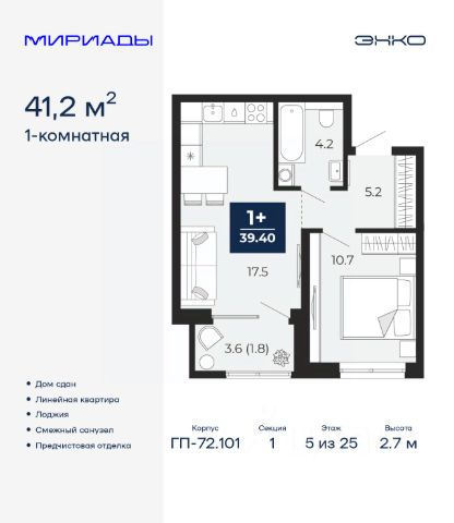 Дом монолитный, черырехподъездный, переменной этажности, от 12 до 14 этажей. Квартира находится в 5-й секции высотой 14 этажей в корпусе ГП-6. На этаже 5 квартир. В подъезде 1 пассажирский и 1 грузовой лифт. Окончание строительства - 2 квартал 2026 года. Оформление сделки по договору долевого участия.