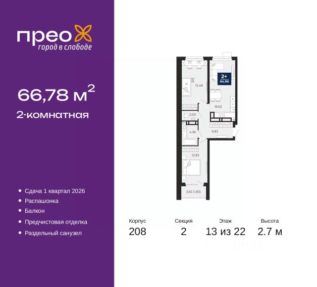 Продается 2-комн. квартира с предчистовой отделкой в ЖК "Прео" на 11 этаже. Общая площадь: 66.78 кв.м., жилая: 28.32 кв.м., площадь просторной кухни-столовой: 18.62 кв.м. Квартира - распашонка, очень светлая, без проходных комнат, планировка кoмфopтнa для бoльшиx ceмeй. В квартире один балкон, один совмещенный и один раздельный санузел. Высота потолков 2.7 м.