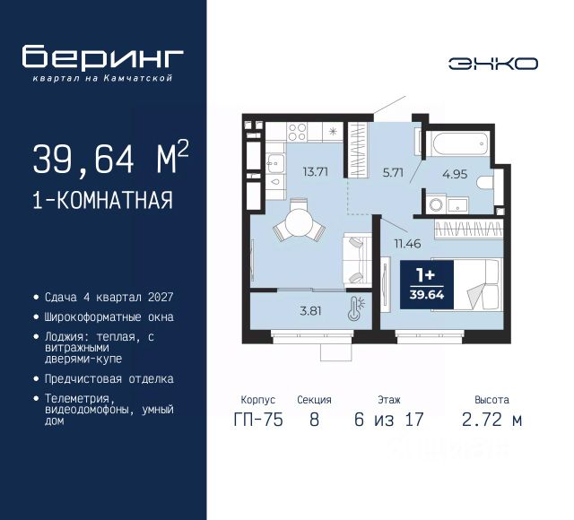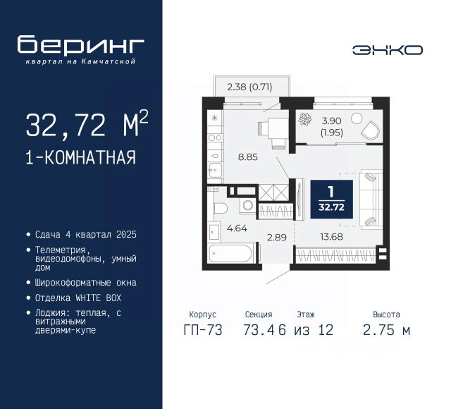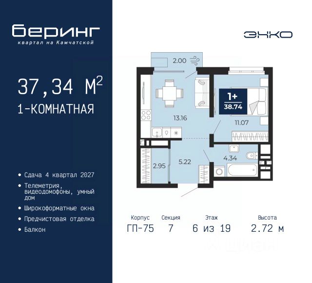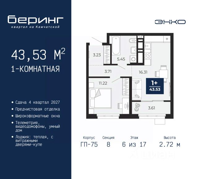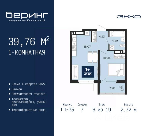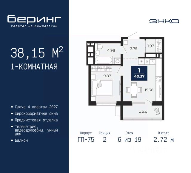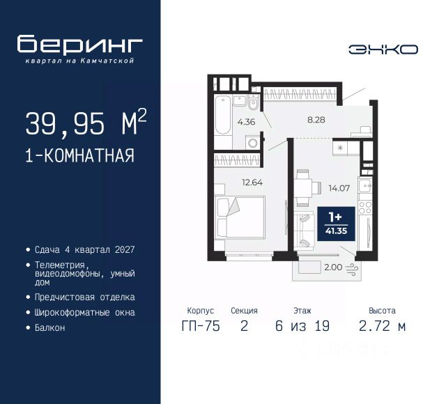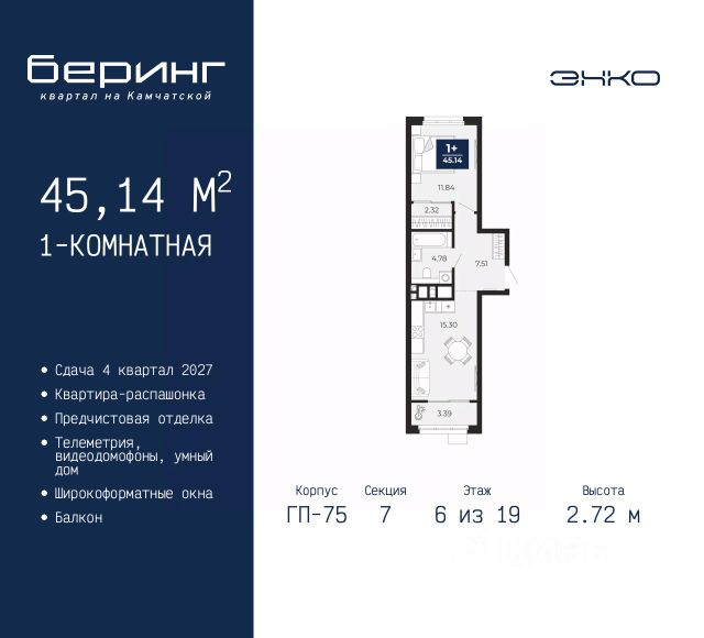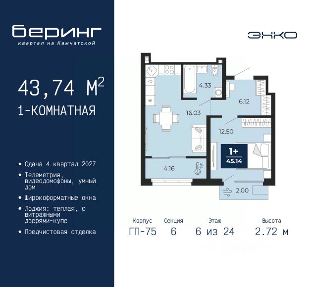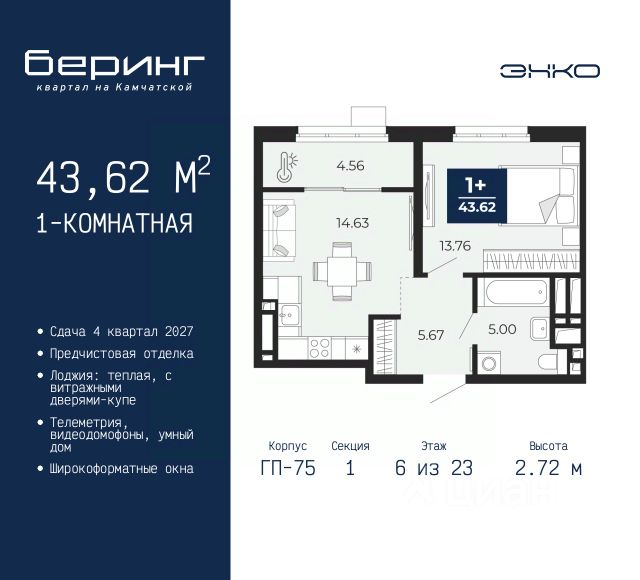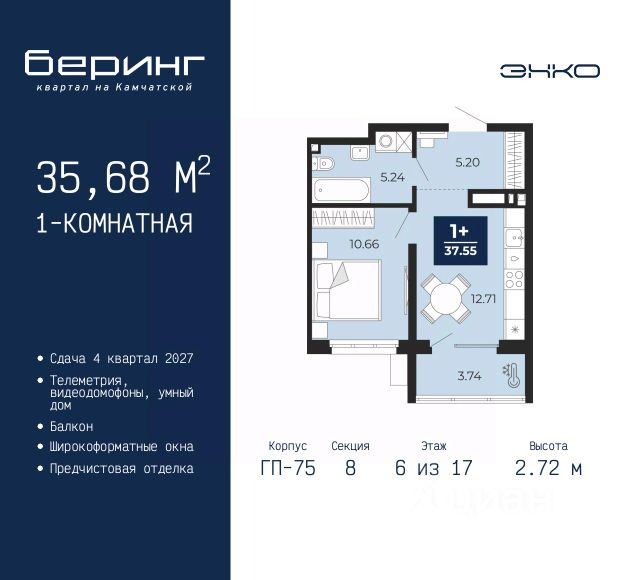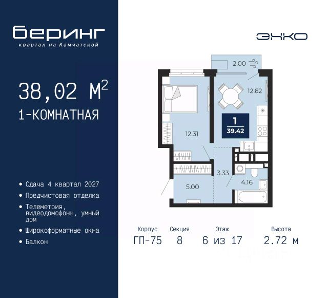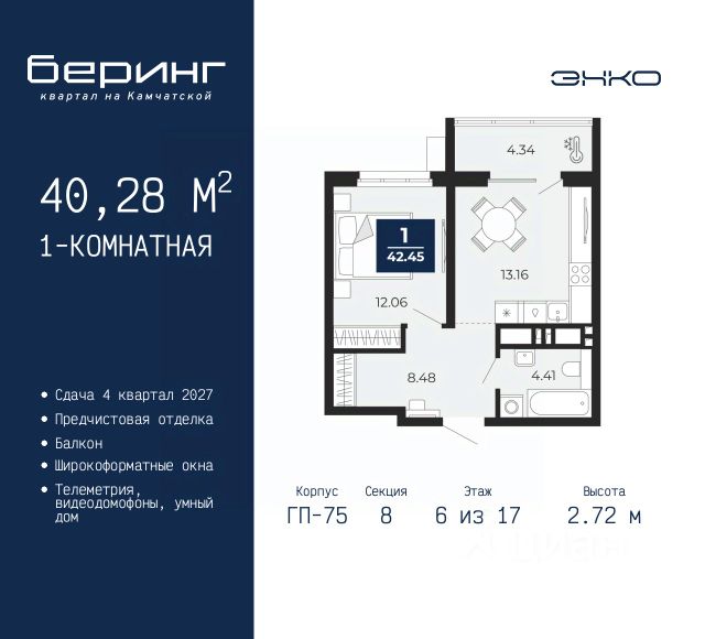 1-комн. квартира от застройщика с предчистовой отделкой в ЖК "Беринг" на 6 этаже. Общая площадь: 42.43 кв.м., жилая: 12.85 кв.м., площадь просторной кухни-столовой: 13.63 кв.м. Все окна выходят на одну сторону. В квартире одна лоджия, один совмещенный санузел. Высота потолков 2.72 м. Дом монолитный, многоподъездный, переменной этажности, от 17 до 24 этажей. Квартира находится во 2-й секции высотой 19 этажей в корпусе ГП-75. На этаже 7 квартир. В подъезде 2 пассажирских и 1 грузовой лифт. Окончание строительства - 4 квартал 2027 года. Оформление сделки по договору долевого участия. Подобно знаменитому исследователю, мы чувствуем себя первооткрывателями этой локации. Хотим показать новую суть места, сформировать для вас жизненный опыт, которого ещё не было. Беринг — район зелёного цвета. Беринг — район, который откроется вам с другой стороны. Впечатлит новым уровнем комфорта и качеством жизни. Беринг — открытие на карте города. Первый квартал расположен в районе Тура, в границах улиц: Камчатская Западносибирская Энтузиастов. Вокруг уже есть всё для того, чтобы ежедневная рутина была лишь частью жизни и не доставляла дискомфорта. Школы и детские сады, магазины и аптеки, поликлиника, места для семейного отдыха, пеших и велопрогулок, и даже рыбалки. Масштабное озеленение дворов — визитная карточка ЭНКО и ваш оазис спокойствия, чтобы отвлечься от повседневности. Раскидистые деревья, кустарники, травы и цветы — осталось остановиться, вдохнуть и расслабиться, глядя на эту природную красоту. Стилистика подъездов продолжает концепцию Беринга, вдохновлённого Камчаткой: сдержанный, но при этом впечатляющий дизайн соседствует с удобством и функциональностью. #269gW3