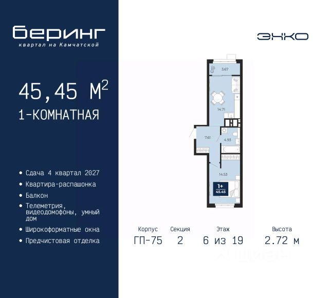 1-комн. квартира от застройщика с предчистовой отделкой в ЖК "Беринг" на 6 этаже. Общая площадь: 42.43 кв.м., жилая: 12.85 кв.м., площадь просторной кухни-столовой: 13.63 кв.м. Все окна выходят на одну сторону. В квартире одна лоджия, один совмещенный санузел. Высота потолков 2.72 м. Дом монолитный, многоподъездный, переменной этажности, от 17 до 24 этажей. Квартира находится во 2-й секции высотой 19 этажей в корпусе ГП-75. На этаже 7 квартир. В подъезде 2 пассажирских и 1 грузовой лифт. Окончание строительства - 4 квартал 2027 года. Оформление сделки по договору долевого участия. Подобно знаменитому исследователю, мы чувствуем себя первооткрывателями этой локации. Хотим показать новую суть места, сформировать для вас жизненный опыт, которого ещё не было. Беринг — район зелёного цвета. Беринг — район, который откроется вам с другой стороны. Впечатлит новым уровнем комфорта и качеством жизни. Беринг — открытие на карте города. Первый квартал расположен в районе Тура, в границах улиц: Камчатская Западносибирская Энтузиастов. Вокруг уже есть всё для того, чтобы ежедневная рутина была лишь частью жизни и не доставляла дискомфорта. Школы и детские сады, магазины и аптеки, поликлиника, места для семейного отдыха, пеших и велопрогулок, и даже рыбалки. Масштабное озеленение дворов — визитная карточка ЭНКО и ваш оазис спокойствия, чтобы отвлечься от повседневности. Раскидистые деревья, кустарники, травы и цветы — осталось остановиться, вдохнуть и расслабиться, глядя на эту природную красоту. Стилистика подъездов продолжает концепцию Беринга, вдохновлённого Камчаткой: сдержанный, но при этом впечатляющий дизайн соседствует с удобством и функциональностью. #269gW3