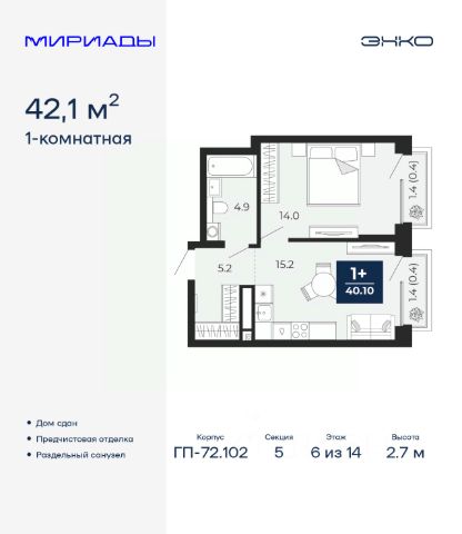 Спешите оформить бронирование, пока действует скидка, предложение ограничено! Стоимость квартиры указана со скидкой, ваша экономия составит 326,260 руб. Информация по телефону, мы вам все подробно расскажем. Продается однокомнатная квартира от застройщика с предчистовой отделкой в ЖК "Мириады" на 6 этаже. Общая площадь: 42.1 кв.м. Высота потолков 2.7 м. Дом монолитный, многоподъездный, переменной этажности, от 14 до 16 этажей. Квартира находится в 5-й секции высотой 14 этажей в корпусе ГП-72.102. На этаже 8 квартир. В подъезде 1 пассажирский и 1 грузовой лифт. На сегодняшний день строительство окончено, дом сдан в 4 квартале 2025 года. Оформление сделки по договору купли-продажи. Вселенная бесконечных историй. Ранее невиданный Тюмени масштаб: территория 240 гектаров и 1 650 000 м² застройки. Мириады это город масштабных перемен и больших возможностей. Город зеленых рощ и зеркальных озер. Город для работы, учебы и развлечений. Город для детей и их родителей. Город для всех и каждого. Проект расположен в районе Мыс рядом с ТРЦ "Тюмень Сити Молл" в границах улицы Тимофея Чаркова, Тобольского тракта и объездной дороги. Срок полного освоения территории - до 2034 года. #z6DE67