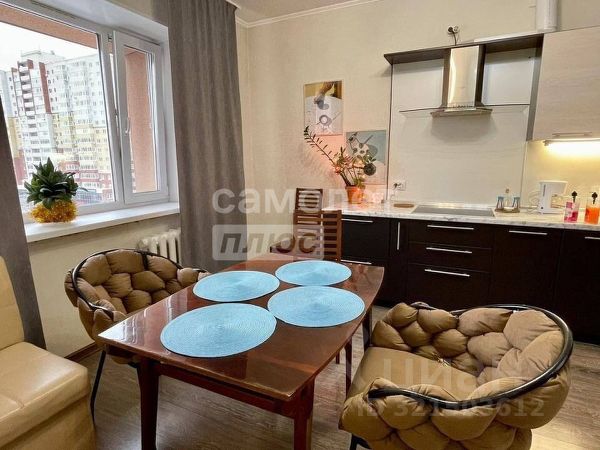 Просторная кухня правильной формы, гостиная 17, м² с окнами на две стороны и выходом на лоджию.