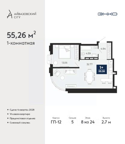 Дом монолитный, многоподъездный, переменной этажности, от 13 до 19 этажей. Квартира находится в 1-й секции высотой 19 этажей в корпусе Дом Огня. На этаже 5 квартир. В подъезде 1 пассажирский и 1 грузовой лифт. Окончание строительства - 3 квартал 2027 года. Оформление сделки по договору долевого участия.
