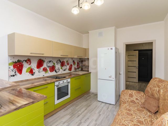 В квартире свежий косметический ремонт. Стены ровные, поклеены обоями, на полу линолеум, натяжные потолки с точечным освещением, теплый пол в санузле.