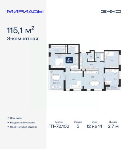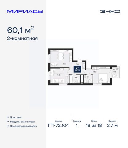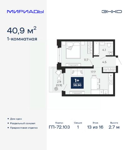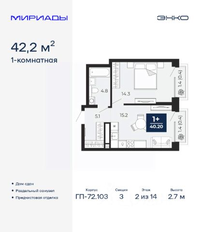 Продается однокомнатная квартира с предчистовой отделкой в ЖК "Мириады" на 13 этаже. Общая площадь: 40 кв.м., жилая: 14.2 кв.м., площадь просторной кухни-столовой: 15.2 кв.м. Все окна выходят на одну сторону. В квартире один совмещенный санузел. Высота потолков 2.7 м.