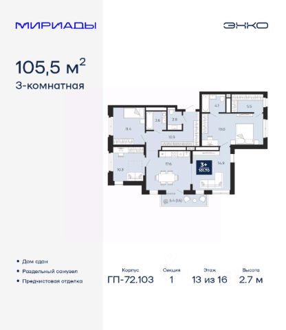 Дом монолитный, трехподъездный, переменной этажности, от 14 до 16 этажей. Квартира находится во 2-й секции высотой 16 этажей в корпусе ГП-72.103. На этаже 6 квартир. В подъезде 1 пассажирский и 1 грузовой лифт. В настоящее время строительство завершено, дом сдан в 4 квартале 2025 года. Оформление сделки по договору купли-продажи.
