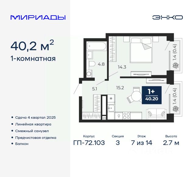 1-комн. квартира с предчистовой отделкой в ЖК "Республики 205" на 7 этаже. Общая площадь: 45.87 кв.м., жилая: 12.1 кв.м., площадь просторной кухни-гостиной: 20.8 кв.м. Все окна выходят на одну сторону. В квартире один балкон, один совмещенный санузел. Высота потолков 2.7 м.