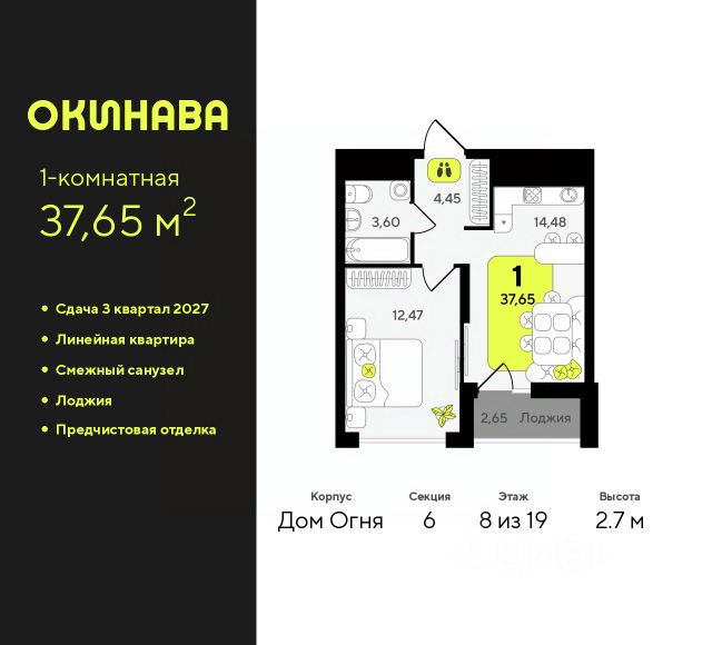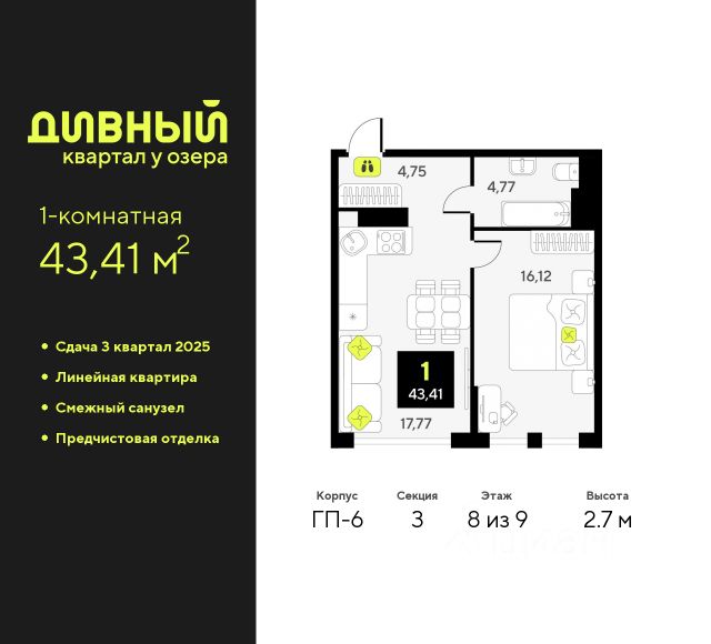 Однокомнатная квартира от застройщика с предчистовой отделкой в ЖК "Айвазовский City" на 8 этаже. Общая площадь: 40.9 кв.м., жилая: 10.6 кв.м., площадь просторной кухни-столовой: 17.7 кв.м. Все окна выходят на одну сторону. В квартире одна лоджия, один совмещенный санузел. Высота потолков 2.72 м. Дом монолитный, многоподъездный, переменной этажности, от 9 до 24 этажей. Квартира находится в 4-й секции высотой 18 этажей в корпусе ГП-7. На этаже 5 квартир. В подъезде 1 пассажирский и 2 грузовых лифта. Окончание строительства - 3 квартал 2026 года. Оформление сделки по договору долевого участия. Новый жилой район располагается в живописном месте на берегу Туры в центральной части города. Принципиально новое пространство для жизни в центре современного города для тех, чьи мечты сбываются, кто нацелен на постоянный рост, перемены к лучшему для себя и своих близких. Каждая деталь Айвазовский City вдохновляет и заряжает на новые свершения: авторская архитектура, сбалансированная продуманная инфраструктура, дизайнерские дворы со спортивными и детскими площадками, парковые зоны с фонтанами, водный канал, украшающий центральный прогулочный маршрут района и многое другое. В 2019 года проект стал лауреатом престижной премии Urban Awards 2019 в номинации "Лучший строящийся региональный жилой комплекс бизнес-класса". Главная особенность Айвазовский City - соседство разных архитектурных школ в рамках одного дома. Изысканная классика, выразительная эклектика и оригинальный модерн - жить в одном из таких домов настоящий повод для гордости. Айвазовский City это идеальное сочетание комфорта, технологий и развитой инфраструктуры. Вход в подъезд возможен с улицы и со двора. Отправляясь на работу или за покупками, жители могут выйти с внешней стороны дома, а для прогулки с ребенком со стороны двора. Экологически чистые материалы и энергосберегающие технологии, качественное освещение общественных зон, видеонаблюдение по всей территории жилого района (в том числе в подъездах, лифтах и в подземном паркинге), закрытые дворы с доступом только для жителей Айвазовский City. Часть домов в Айвазовский City будут оснащены подземным паркингом. Востребованный в нашем климатическом поясе формат хранения автомобилей защитит собственность владельца в любое время года. Аккредитация в банках: "Сбербанк России", ПАО Банк "ВТБ", ПАО "Газпромбанк", ОАО "Альфа-Банк", ПАО АКБ "Абсолют Банк" и других. #zMZZ62