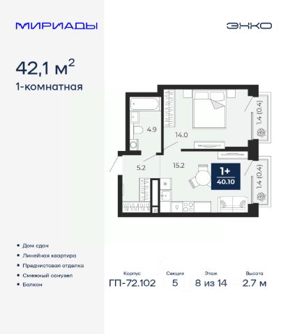 Продается однокомнатная квартира от застройщика с предчистовой отделкой в ЖК "Мириады" на 8 этаже. Общая площадь: 43.8 кв.м., жилая: 13.6 кв.м., площадь просторной кухни-столовой: 13.6 кв.м. Квартира - распашонка, без проходных комнат, окна выходят на paзные стороны дома. В квартире один балкон, один совмещенный санузел. Высота потолков 2.7 м. Дом монолитный, многоподъездный, переменной этажности, от 14 до 16 этажей. Квартира находится во 2-й секции высотой 16 этажей в корпусе ГП-72.102. На этаже 6 квартир. В подъезде 1 пассажирский и 1 грузовой лифт. На сегодняшний день строительство окончено, дом сдан в 4 квартале 2025 года. Оформление сделки по договору купли-продажи. Вселенная бесконечных историй. Ранее невиданный Тюмени масштаб: территория 240 гектаров и 1 650 000 м² застройки. Мириады это город масштабных перемен и больших возможностей. Город зеленых рощ и зеркальных озер. Город для работы, учебы и развлечений. Город для детей и их родителей. Город для всех и каждого. Проект расположен в районе Мыс рядом с ТРЦ "Тюмень Сити Молл" в границах улицы Тимофея Чаркова, Тобольского тракта и объездной дороги. Срок полного освоения территории - до 2034 года. #Z70DmD
