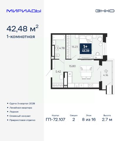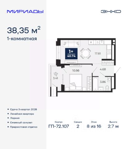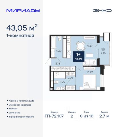 Торопитесь оформить бронирование по этой цене! Срок предложения ограничен! Стоимость квартиры указана со скидкой, ваша экономия составит 335,000 RUB. Звоните, мы вам все подробно расскажем! Продается 1-комн. квартира с предчистовой отделкой в ЖК "Мириады" на 8 этаже. Общая площадь: 43.05 кв.м., жилая: 10.22 кв.м., площадь просторной кухни-столовой: 17.47 кв.м. Все окна выходят на одну сторону. В квартире один балкон, два совмещенных санузла. Высота потолков 2.7 м. Дом монолитный, двухподъездный, переменной этажности, от 14 до 16 этажей. Квартира находится во 2-й секции высотой 16 этажей в корпусе ГП-72.107. На этаже 10 квартир. В подъезде 1 пассажирский и 1 грузовой лифт. Окончание строительства - 3 квартал 2028 года. Оформление сделки по договору долевого участия. Вселенная бесконечных историй. Ранее невиданный Тюмени масштаб: территория 240 гектаров и 1 650 000 м² застройки. Мириады это город масштабных перемен и больших возможностей. Город зеленых рощ и зеркальных озер. Город для работы, учебы и развлечений. Город для детей и их родителей. Город для всех и каждого. Проект расположен в районе Мыс рядом с ТРЦ "Тюмень Сити Молл" в границах улицы Тимофея Чаркова, Тобольского тракта и объездной дороги. Срок полного освоения территории - до 2034 года. #zmdAOb