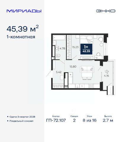 Торопитесь забронировать, пока действует скидка, период предложения ограничен! Стоимость квартиры указана со скидкой, ваша экономия составит 334,158 руб. Звоните, мы вам все подробно расскажем. Однокомнатная квартира от застройщика с предчистовой отделкой в ЖК "Мириады" на 8 этаже. Общая площадь: 41 кв.м., жилая: 14 кв.м., площадь просторной кухни-столовой: 14.7 кв.м. Все окна выходят на одну сторону. В квартире два балкона, один совмещенный санузел. Высота потолков 2.7 м. Дом монолитный, многоподъездный, переменной этажности, от 14 до 16 этажей. Квартира находится в 1-й секции высотой 16 этажей в корпусе ГП-72.102. На этаже 9 квартир. В подъезде 1 пассажирский и 1 грузовой лифт. На сегодняшний день строительство окончено, дом сдан в 4 квартале 2025 года. Оформление сделки по договору купли-продажи. Вселенная бесконечных историй. Ранее невиданный Тюмени масштаб: территория 240 гектаров и 1 650 000 м² застройки. Мириады это город масштабных перемен и больших возможностей. Город зеленых рощ и зеркальных озер. Город для работы, учебы и развлечений. Город для детей и их родителей. Город для всех и каждого. Проект расположен в районе Мыс рядом с ТРЦ "Тюмень Сити Молл" в границах улицы Тимофея Чаркова, Тобольского тракта и объездной дороги. Срок полного освоения территории - до 2034 года. #ZmdEg8