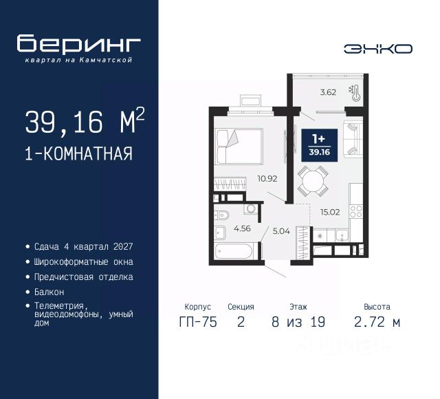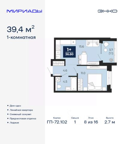 Продается однокомнатная квартира от застройщика с предчистовой отделкой в ЖК "Мириады" на 8 этаже. Общая площадь: 43.8 кв.м., жилая: 13.6 кв.м., площадь просторной кухни-столовой: 13.6 кв.м. Квартира - распашонка, без проходных комнат, окна выходят на paзные стороны дома. В квартире один балкон, один совмещенный санузел. Высота потолков 2.7 м. Дом монолитный, многоподъездный, переменной этажности, от 14 до 16 этажей. Квартира находится во 2-й секции высотой 16 этажей в корпусе ГП-72.102. На этаже 6 квартир. В подъезде 1 пассажирский и 1 грузовой лифт. На сегодняшний день строительство окончено, дом сдан в 4 квартале 2025 года. Оформление сделки по договору купли-продажи. Вселенная бесконечных историй. Ранее невиданный Тюмени масштаб: территория 240 гектаров и 1 650 000 м² застройки. Мириады это город масштабных перемен и больших возможностей. Город зеленых рощ и зеркальных озер. Город для работы, учебы и развлечений. Город для детей и их родителей. Город для всех и каждого. Проект расположен в районе Мыс рядом с ТРЦ "Тюмень Сити Молл" в границах улицы Тимофея Чаркова, Тобольского тракта и объездной дороги. Срок полного освоения территории - до 2034 года. #Z70DmD