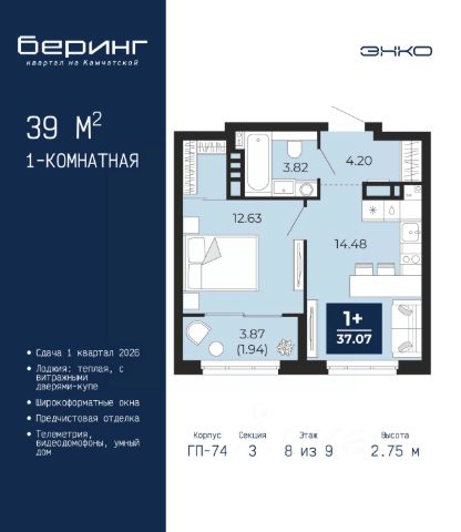 Просторная однокомнатная квартира с предчистовой отделкой в ЖК "Мотивы" на 8 этаже. Общая площадь: 39.47 кв.м., жилая: 12.37 кв.м., площадь просторной кухни-столовой: 13.53 кв.м. Все окна выходят на одну сторону. В квартире одна лоджия, один совмещенный санузел. Высота потолков 2.7 м.