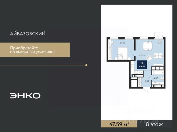 Однокомнатная квартира с предчистовой отделкой в ЖК "Айвазовский" на 8 этаже. Общая площадь: 47.59 кв.м., жилая: 13.98 кв.м., площадь просторной кухни-столовой: 24.3 кв.м. Все окна выходят на одну сторону. В квартире один совмещенный санузел. Высота потолков 2.7 м.