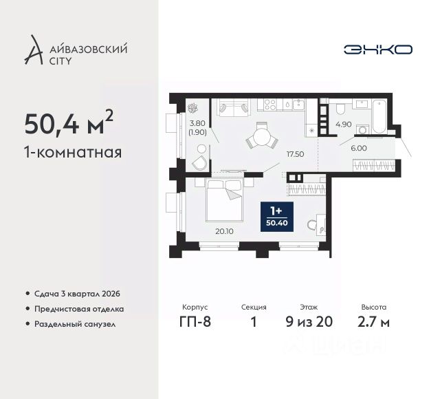 Продается однокомнатная квартира с предчистовой отделкой в ЖК "Окинава" на 9 этаже. Общая площадь: 39.58 кв.м., жилая: 12.87 кв.м., площадь просторной кухни-столовой: 15.5 кв.м. Все окна выходят на одну сторону. В квартире один балкон, один совмещенный санузел. Высота потолков 2.7 м.