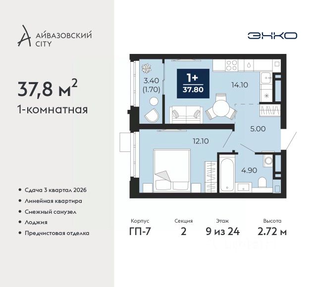 Дом монолитный, многоподъездный, переменной этажности, от 11 до 19 этажей. Квартира находится в 8-й секции высотой 19 этажей в корпусе Дом Воды. На этаже 9 квартир. В подъезде 1 пассажирский и 1 грузовой лифт. Окончание строительства - 4 квартал 2026 года. Оформление сделки по договору долевого участия.