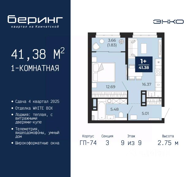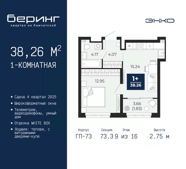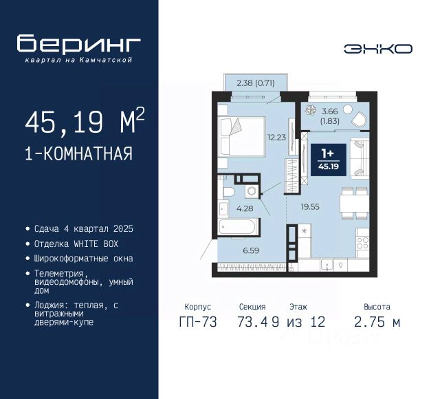 1-комн. квартира от застройщика в ЖК "Беринг" на 9 этаже. Квартира без отделки, полностью готова к ремонту. Общая площадь: 45.19 кв.м., жилая: 12.23 кв.м., площадь просторной кухни-столовой: 19.55 кв.м. Все окна выходят на одну сторону. В квартире один балкон и одна лоджия, один совмещенный санузел. Высота потолков 2.75 м. Дом монолитный, многоподъездный, переменной этажности, от 9 до 22 этажей. Квартира находится в 73.4-й секции высотой 12 этажей в корпусе ГП-73. На этаже 8 квартир. В подъезде 1 пассажирский и 1 грузовой лифт. Окончание строительства - 4 квартал 2025 года. Оформление сделки по договору долевого участия. Подобно знаменитому исследователю, мы чувствуем себя первооткрывателями этой локации. Хотим показать новую суть места, сформировать для вас жизненный опыт, которого ещё не было. Беринг — район зелёного цвета. Беринг — район, который откроется вам с другой стороны. Впечатлит новым уровнем комфорта и качеством жизни. Беринг — открытие на карте города. Первый квартал расположен в районе Тура, в границах улиц: Камчатская Западносибирская Энтузиастов. Вокруг уже есть всё для того, чтобы ежедневная рутина была лишь частью жизни и не доставляла дискомфорта. Школы и детские сады, магазины и аптеки, поликлиника, места для семейного отдыха, пеших и велопрогулок, и даже рыбалки. Масштабное озеленение дворов — визитная карточка ЭНКО и ваш оазис спокойствия, чтобы отвлечься от повседневности. Раскидистые деревья, кустарники, травы и цветы — осталось остановиться, вдохнуть и расслабиться, глядя на эту природную красоту. Стилистика подъездов продолжает концепцию Беринга, вдохновлённого Камчаткой: сдержанный, но при этом впечатляющий дизайн соседствует с удобством и функциональностью. #2SFmed