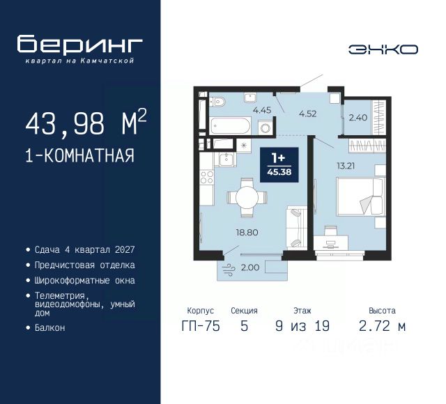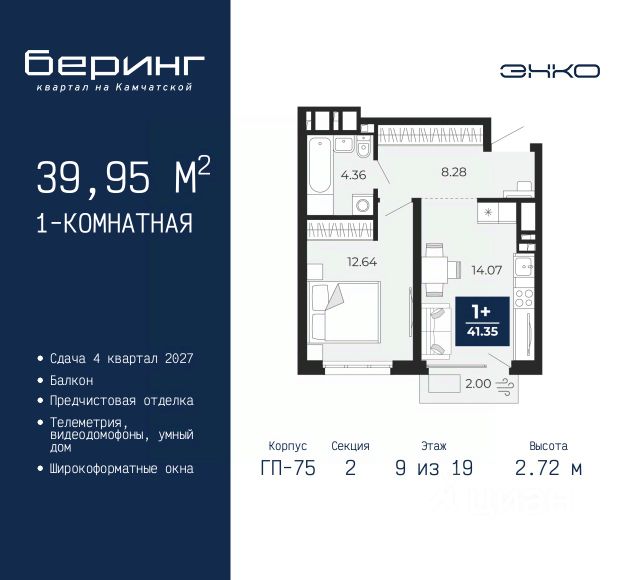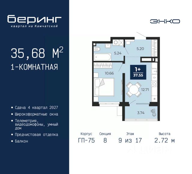 Продается 1-комн. квартира в ЖК "Беринг" на 9 этаже. Квартира без отделки, полностью готова к ремонту. Общая площадь: 39.13 кв.м., жилая: 14.5 кв.м., площадь просторной кухни-столовой: 10.57 кв.м. Все окна выходят на одну сторону. В квартире одна лоджия, один совмещенный санузел. Высота потолков 2.75 м. Дом монолитный, многоподъездный, переменной этажности, от 9 до 22 этажей. Квартира находится в 73.5-й секции высотой 21 этаж в корпусе ГП-73. На этаже 6 квартир. В подъезде 1 пассажирский и 1 грузовой лифт. Окончание строительства - 4 квартал 2025 года. Оформление сделки по договору долевого участия. Подобно знаменитому исследователю, мы чувствуем себя первооткрывателями этой локации. Хотим показать новую суть места, сформировать для вас жизненный опыт, которого ещё не было. Беринг — район зелёного цвета. Беринг — район, который откроется вам с другой стороны. Впечатлит новым уровнем комфорта и качеством жизни. Беринг — открытие на карте города. Первый квартал расположен в районе Тура, в границах улиц: Камчатская Западносибирская Энтузиастов. Вокруг уже есть всё для того, чтобы ежедневная рутина была лишь частью жизни и не доставляла дискомфорта. Школы и детские сады, магазины и аптеки, поликлиника, места для семейного отдыха, пеших и велопрогулок, и даже рыбалки. Масштабное озеленение дворов — визитная карточка ЭНКО и ваш оазис спокойствия, чтобы отвлечься от повседневности. Раскидистые деревья, кустарники, травы и цветы — осталось остановиться, вдохнуть и расслабиться, глядя на эту природную красоту. Стилистика подъездов продолжает концепцию Беринга, вдохновлённого Камчаткой: сдержанный, но при этом впечатляющий дизайн соседствует с удобством и функциональностью. #2Us5VS