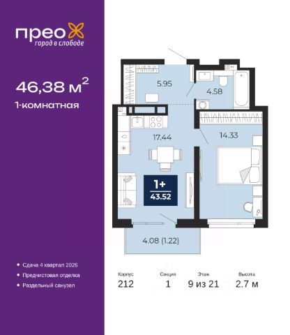Продаётся квартира площадью 36.9 м2 в жилом комплексе "Айрис". Квартира находится на 9 этаже, жилая площадь квартиры 9.9 м2, площадь просторной кухни — 17.9 м2. Среди особенностей планировки — изолированные комнаты с окнами на одну сторону, 1 совмещённый санузел. Срок сдачи — III кв. 2027 Жилой комплекс "Айрис" — это: - фиджитал-квартал в Тюмени - дома высотой от 7 до 25 этажей - квартиры с системой "Умный дом" - цифровые технологии как элемент благоустройства Окружение В нескольких минутах ходьбы от дома — парк "Комарово" с волейбольной площадкой, открытым кинотеатром, зонами для барбекю и катком. Неподалеку от Айрис находится центр иппотерапии, где можно покататься на лошадях и взять уроки верховой езды. На территории Айрис появится собственный парк с прогулочными аллеями. Инфраструктура В 5-10 минутах от квартала открыты 2 детских сада и гимназия. На шопинг можно отправиться в торговые комплексы "Колумб" и "Кристалл" — они находятся недалеко от дома. Благоустройство Уютный двор — приватное пространство для жителей. В беседках можно будет почитать книгу в тишине, а в тени деревьев устроиться на пикник. На крыше многоуровневого паркинга будет лаунж-зона с кинотеатром, баскетбольная площадка и воркаут-пространство, где можно позаниматься с виртуальным тренером — достаточно отсканировать код. Лобби Интерьеры лобби выполнены в пастельных тонах с элементами фиджитал-решений. Для отдыха и ожидания гостей создана лаунж-зона. Также есть гостевые санузлы. Колясочные Возвращайтесь налегке после прогулки с малышом — оставить коляску можно в специальном помещении на первом этаже. Кладовые Для сезонных и габаритных вещей предусмотрены отдельные кладовые на цокольном этаже. В каждом помещении уже проведено электричество и выполнена стяжка пола. Паркинг На территории — два многоуровневых наземных паркинга. Один из них примыкает к домам — из него можно напрямую пройти в парадные. Планировки Планировки квартала — от компактной студии до сити-хауса с собственным палисадником — соответствуют любым жизненным сценариям. Можно выбрать квартиры с террасами и готовыми дизайнерскими интерьерами.