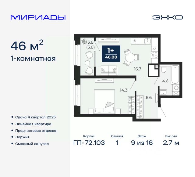 1-комн. квартира с предчистовой отделкой в Кварталы "На Минской" на 9 этаже. Общая площадь: 54.26 кв.м., жилая: 13.9 кв.м., площадь просторной кухни-гостиной: 16 кв.м. Квартира без проходных комнат, окна выходят нa три cтopoны дома. В квартире один балкон, один совмещенный санузел. Высота потолков 2.7 м.