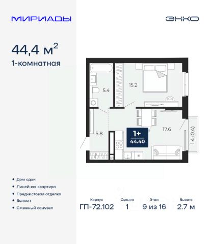 Спешите забронировать по акционной цене! Предложение ограничено! Стоимость квартиры указана со скидкой, ваша экономия составит 340,794 RUB. Звоните, наши менеджеры вам все расскажут! 1-комн. квартира от застройщика с предчистовой отделкой в ЖК "Мириады" на 9 этаже. Общая площадь: 44.2 кв.м., жилая: 22.2 кв.м., площадь просторной кухни-столовой: 10.1 кв.м. Все окна выходят на одну сторону. В квартире один балкон, один совмещенный санузел. Высота потолков 2.7 м. Дом монолитный, двухподъездный, переменной этажности, от 14 до 18 этажей. Квартира находится во 2-й секции высотой 14 этажей в корпусе ГП-72.104. На этаже 8 квартир. В подъезде 1 пассажирский и 1 грузовой лифт. Строительство завершено, дом сдан в 4 квартале 2025 года. Оформление сделки по договору купли-продажи. Вселенная бесконечных историй. Ранее невиданный Тюмени масштаб: территория 240 гектаров и 1 650 000 м² застройки. Мириады это город масштабных перемен и больших возможностей. Город зеленых рощ и зеркальных озер. Город для работы, учебы и развлечений. Город для детей и их родителей. Город для всех и каждого. Проект расположен в районе Мыс рядом с ТРЦ "Тюмень Сити Молл" в границах улицы Тимофея Чаркова, Тобольского тракта и объездной дороги. Срок полного освоения территории - до 2034 года. #2mtegf