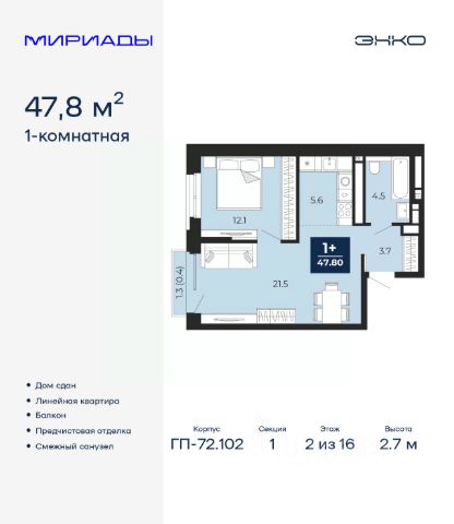 Продается 1-комн. квартира от застройщика с предчистовой отделкой в ЖК "Республики 205" на 7 этаже. Общая площадь: 44.84 кв.м., жилая: 9.9 кв.м., площадь просторной кухни-гостиной: 20.9 кв.м. Все окна выходят на одну сторону. В квартире один балкон, один совмещенный санузел. Высота потолков 2.7 м. Купить квартиру можно с помощью программ покупки от застройщика Брусника: - ипотека по эксклюзивной ставке с помощью в получении положительного кредитного решения через сервис ипотечный брокер; - квартиры в рассрочку без процентов от застройщика Брусника; - обмен квартиры на новую. Получить одобрение ипотеки или рассрочку, а также осуществить обмен квартир можно онлайн. Дом монолитный, многоподъездный, переменной этажности, от 7 до 16 этажей. Квартира находится в 7-й секции высотой 7 этажей в корпусе 2. На этаже 6 квартир. В подъезде 1 грузовой лифт. Начало строительства - 1 квартал 2024 года. Окончание строительства - 1 квартал 2026 года. Оформление сделки по договору долевого участия. Район Проект расположен в границах улиц Пермякова, Энергетиков, Воровского и Республики. До центра города — 10 минут на машине. Рядом — автомобильная развязка на пересечении улиц Пермякова и Республики. В шаговой доступности есть школы, детские сады, поликлиники, крупный торговый центр, автовокзал и несколько скверов. Проект "Республики 205" — это проект комплексного развития территории, уникальный по своему наполнению. Переосмысляя бывшую территорию завода медицинского оборудования, мы создадим новое место силы — микрорайон, насыщенный деловой, развлекательной, рекреационной, игровой, образовательной и медицинской инфраструктурой. До каждого полезного сервиса здесь можно будет дойти за 15 минут. Локальными центрами "Республики 205" будут общественные пространства — скверы, парки, бульвары и площади. В границах нашего участка мы намерены разместить школу, рассчитанную на 1550 учеников, два детских сада на 300 мест и встроенный детский сад на 100 мест. В одном из цехов бывшего завода расположится креативный кластер "Кузница". Он станет площадкой для нескольких институций — галереи, лектория, книжного магазина-библиотеки, кинобара и точек креативного pop-up-ритейла. Пешеходные бульвары внутри района соединят между собой улицу ресторанов, детские и спортивные площадки, событийную площадь и летний кинотеатр. Идентификатор квартиры по базе застройщика: РСП-02-7-7. #z5SCFW Купить квартиру евродвушку в новостройке в Тюмени.