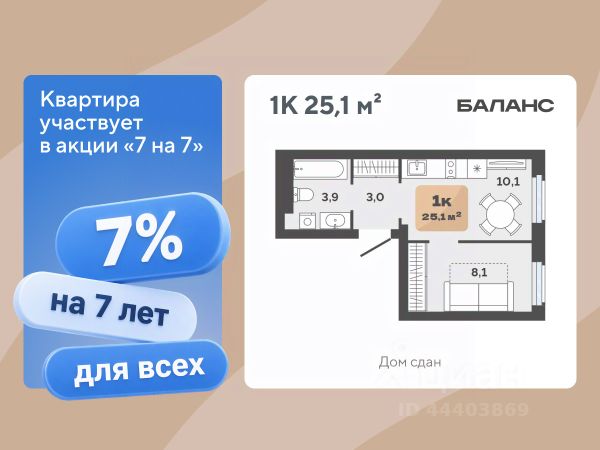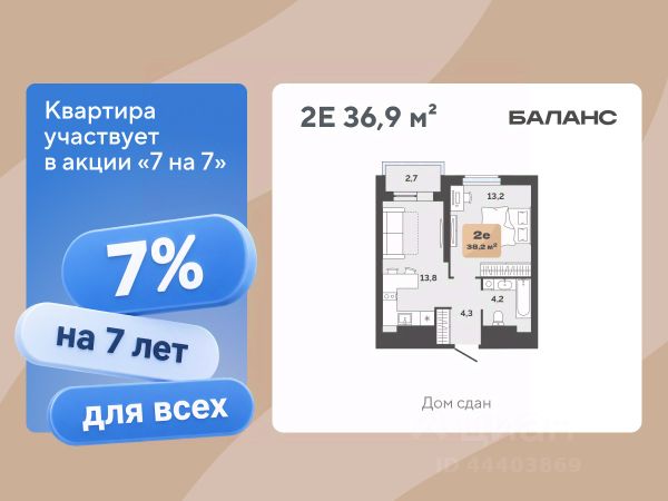 Однокомнатная квартира с предчистовой отделкой в ЖК "Республики 205" на 9 этаже. Общая площадь: 35.47 кв.м., жилая: 9 кв.м., площадь просторной кухни-гостиной: 16 кв.м. Все окна выходят на одну сторону. В квартире один балкон, один совмещенный санузел. Высота потолков 2.7 м. Купить квартиру можно с помощью программ покупки от застройщика Брусника: - ипотека по эксклюзивной ставке с помощью в получении положительного кредитного решения через сервис ипотечный брокер; - квартиры в рассрочку без процентов от застройщика Брусника; - обмен квартиры на новую. Получить одобрение ипотеки или рассрочку, а также осуществить обмен квартир можно онлайн. Дом монолитный, многоподъездный, переменной этажности, от 7 до 16 этажей. Квартира находится в 1-й секции высотой 9 этажей в корпусе 2. На этаже 10 квартир. В подъезде 1 грузовой лифт. Начало строительства - 1 квартал 2024 года. Окончание строительства - 2 квартал 2026 года. Оформление сделки по договору долевого участия. Район Проект расположен в границах улиц Пермякова, Энергетиков, Воровского и Республики. До центра города — 10 минут на машине. Рядом — автомобильная развязка на пересечении улиц Пермякова и Республики. В шаговой доступности есть школы, детские сады, поликлиники, крупный торговый центр, автовокзал и несколько скверов. Проект "Республики 205" — это проект комплексного развития территории, уникальный по своему наполнению. Переосмысляя бывшую территорию завода медицинского оборудования, мы создадим новое место силы — микрорайон, насыщенный деловой, развлекательной, рекреационной, игровой, образовательной и медицинской инфраструктурой. До каждого полезного сервиса здесь можно будет дойти за 15 минут. Локальными центрами "Республики 205" будут общественные пространства — скверы, парки, бульвары и площади. В границах нашего участка мы намерены разместить школу, рассчитанную на 1550 учеников, два детских сада на 300 мест и встроенный детский сад на 100 мест. В одном из цехов бывшего завода расположится креативный кластер "Кузница". Он станет площадкой для нескольких институций — галереи, лектория, книжного магазина-библиотеки, кинобара и точек креативного pop-up-ритейла. Пешеходные бульвары внутри района соединят между собой улицу ресторанов, детские и спортивные площадки, событийную площадь и летний кинотеатр. Идентификатор квартиры по базе застройщика: РСП-02-1-1. Купить 1-комнатную квартиру в ипотеку в округе Ленинский в городе Тюмень.