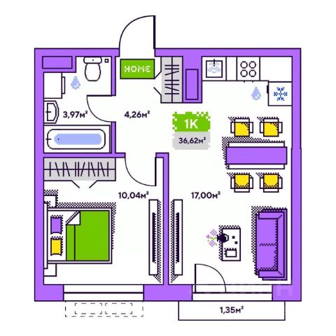 Квартира отличается правильной планировкой: просторная кухня-гостиная с выходом на балкон, большая спальня, совмещённый санузел и удобная ниша под шкаф в коридоре. Всё это создаёт комфортное пространство для жизни.
