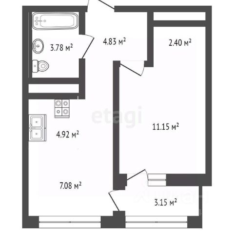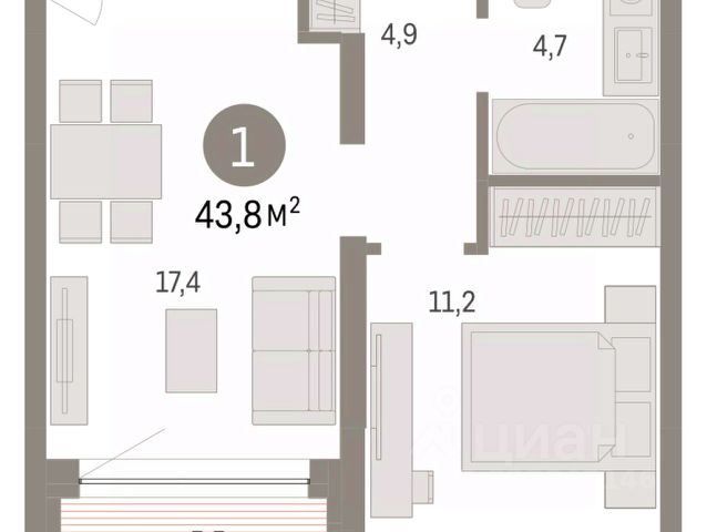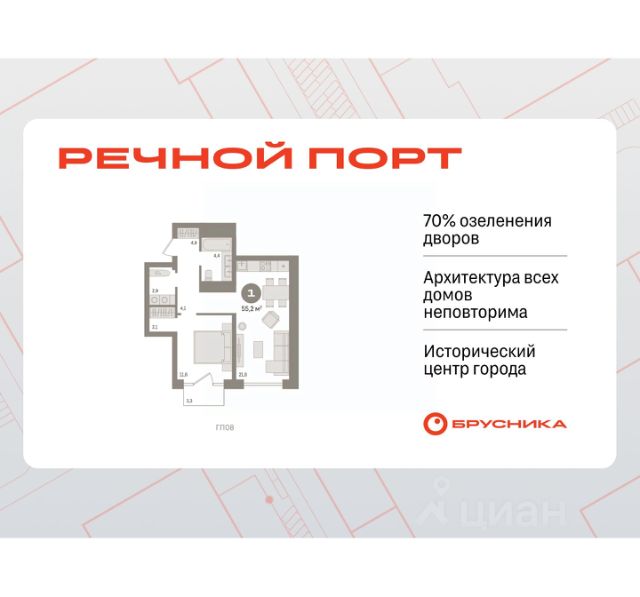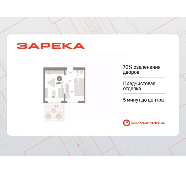 Квартира с кухней-гостиной и одной спальней в Доме у озера. Особенности планировки: вид во двор, предчистовая отделка, балкон.