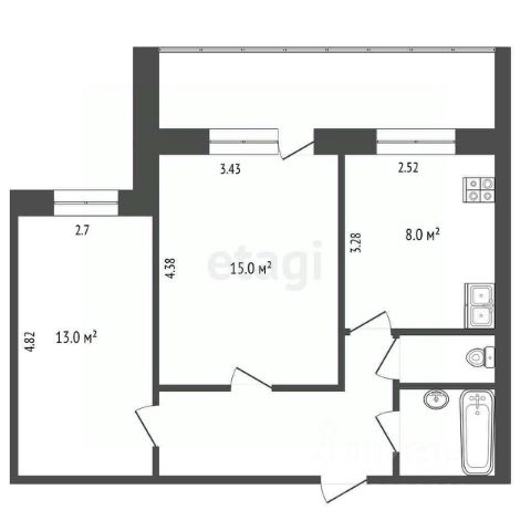 Площадь квартиры 47,8м2, комнаты изолированы, кухня-8,3м2. Санузел раздельный.