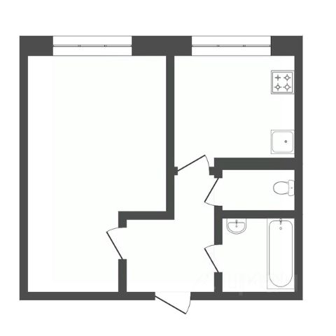 Просторная кухня правильной формы, гостиная 17, м² с окнами на две стороны и выходом на лоджию.