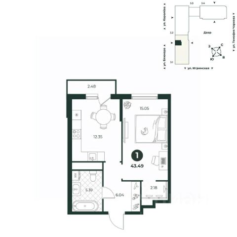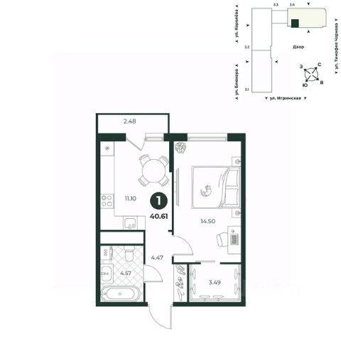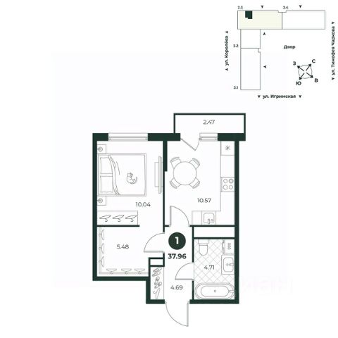 Классическая однокомнатная квартира с мастер-спальней, оборудованной гардеробной. Из кухни можно выйти на балкон, откуда открывается прекрасный вид на двор. В прихожей есть ниша под шкаф. Санузел совмещенный.