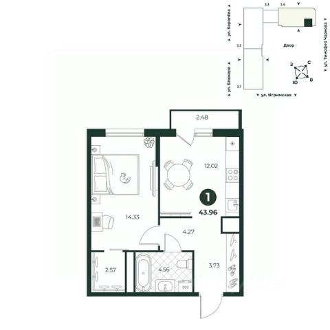 Однокомнатная квартира с мастер-спальней, оборудованной гардеробной. Из кухни есть выход на балкон. Санузел совмещенный, В прихожей есть ниша под шкаф. Окна выходят во двор.