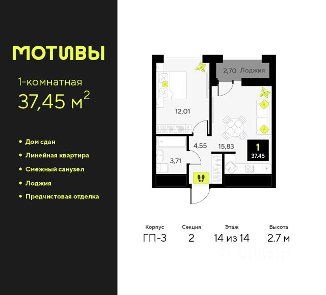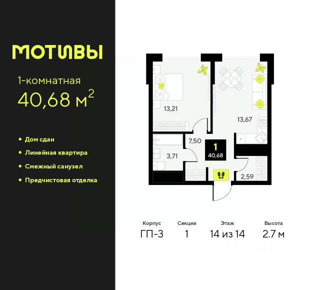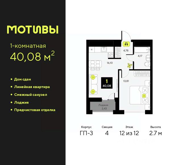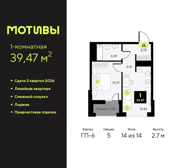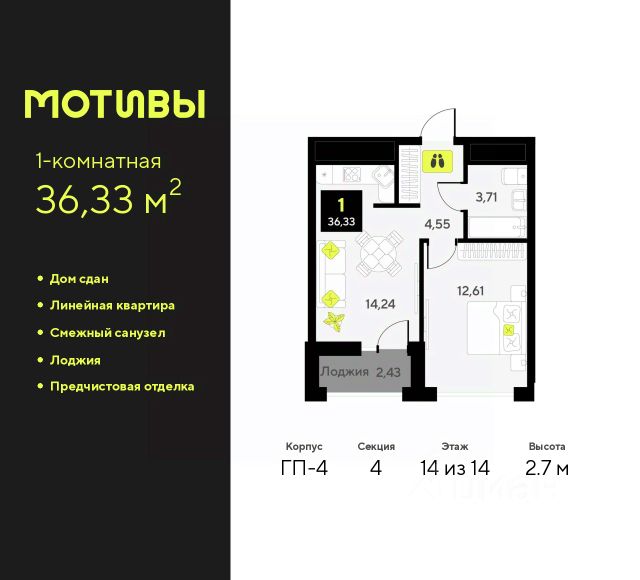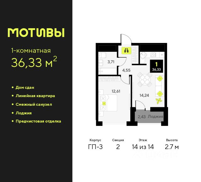 Продается 1-комн. квартира от застройщика с предчистовой отделкой в ЖК "Мотивы" на 14 этаже. Общая площадь: 38.39 кв.м., жилая: 11.84 кв.м., площадь просторной кухни-столовой: 15.62 кв.м. Все окна выходят на одну сторону. В квартире одна лоджия, один совмещенный санузел. Высота потолков 2.7 м. Квартира будет сдаваться с предчистовой отделкой White Box: выровнены и оштукатурены стены, проведено электричество и отопление, установлены радиаторы. Вы также можете приобрести квартиру с ремонтом от застройщика, представленным в трех цветовых решениях Scandi, Wood и Coffee и включающим ламинат, обои под покраску, двери, натяжной потолок и санузел с сантехникой. При желании вы можете заказать отделку под ключ, варианты возможных решений представлены в альбоме фотографий. Дом монолитный, черырехподъездный, переменной этажности, от 12 до 14 этажей. Квартира находится в 1-й секции высотой 14 этажей в корпусе ГП-6. На этаже 12 квартир. В подъезде 1 пассажирский и 1 грузовой лифт. Окончание строительства - 2 квартал 2026 года. Оформление сделки по договору долевого участия. Закрытая от автомобилей территория, безопасный двор и камеры видеонаблюдения - гаранты вашего спокойствия. Квартал будет располагать богатой инфраструктурой: на первых этажах разместятся магазины, пекарни, кофейни, пункты выдачи, аптеки, детские центры, цветочные салоны и многое другое, что сделает жизнь поистине комфортной. Рядом находится парк общей площадью почти 5000 м², в котором располагаются локации для игр и отдыха жителей, здесь можно совершить утреннюю пробежку или прогуляться после рабочего дня. В парке есть зона воркаута с тренажерами для взрослых, игровые комплексы с горками и канатный комплекс для детей разных возрастов, качели и лавочки для отдыха, площадки для командных видов спорта и для панна-футбола. В ЖК "Мотивы" всё продумано до мелочей: светлые холлы входных групп, оформленные в едином стиле, просторные колясочные, лапомойки для питомцев. На территории комплекса находятся 2 8-ми этажных паркинга и более 1000 м/м на открытой парковке. Жилой комплекс находится в одном из экологически благоприятных районов Тюмени, недалеко от Плехановского бора. При этом до центра города можно добраться за 15 минут, а до международного аэропорта Рощино за 13 минут. Окончание строительства: ГП 1, 2, 3, 4 сдача до конца 2024 года, ГП 6, 7, 8 сдача 2 квартал 2026 года. #Z4a8Vt