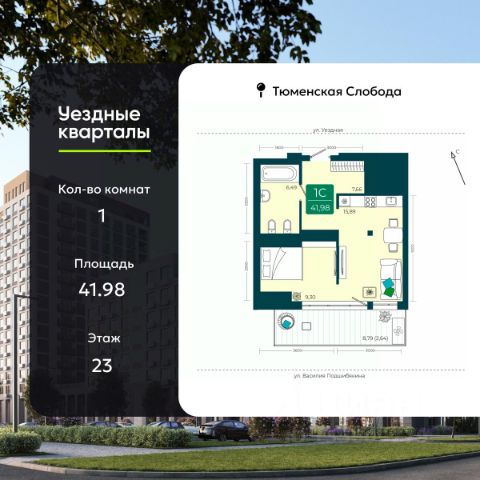 1-комн. квартира с предчистовой отделкой в ЖК "Уездные кварталы" на 23 этаже. Общая площадь: 41.98 кв.м., жилая: 9.3 кв.м., площадь просторной кухни-столовой: 15.89 кв.м. Все окна выходят на одну сторону. В квартире один балкон, один совмещенный санузел. Высота потолков 2.6 м. Квартира находится в корпусе ГП-4. Дом монолитный, одноподъездный, высотой 23 этажа. На этаже 10 квартир. В подъезде 1 пассажирский и 1 грузовой лифт. В настоящее время строительство окончено, дом сдан в 3 квартале 2025 года. Оформление сделки по договору купли-продажи. "Уездные кварталы" - семейный жилой комплекс комфорт-класса с авторской архитектурой и трехуровневым ландшафтным озеленением. Рядом расположены крупные транспортные развязки, которые позволяют добраться в любую точку города за 15 минут. Жилой комплекс находится в современном районе с развитой инфраструктурой, на первой линии Тюменской Слободы. Вокруг есть всё необходимое в шаговой доступности: новые детские сады и школы, остановки общественного транспорта, магазины, кафе и рестораны, поликлиника, детская школа искусств, парки и спортивный комплекс. На первых этажах квартала расположена собственная коммерческая сеть, а также свой соседский центр. Проект включает 5 домов переменной этажности с более чем 100 планировками - с террасами, французскими балконами и мастер-спальнями. Закрытые дворы оборудованы интерактивными площадками для игр, спортивными зонами и местами тихого отдыха. Вдоль жилого комплекса расположен пешеходный бульвар с сухим фонтаном, а для автомобилей предусмотрен теплый паркинг. Часть квартир можно приобрести с ремонтом, мебелью и техникой от застройщика, а расходы включить в ипотечный платеж. #ZmSC2C