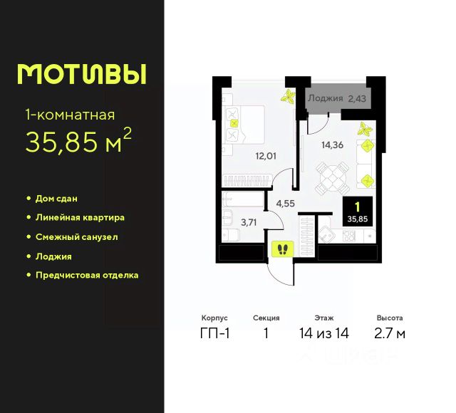 Просторная однокомнатная квартира с предчистовой отделкой в ЖК "Мотивы" на 12 этаже. Общая площадь: 35.85 кв.м., жилая: 12.01 кв.м., площадь просторной кухни-столовой: 14.36 кв.м. Все окна выходят на одну сторону. В квартире одна лоджия, один совмещенный санузел. Высота потолков 2.7 м. Квартира будет сдаваться с предчистовой отделкой White Box: выровнены и оштукатурены стены, проведено электричество и отопление, установлены радиаторы. Вы также можете приобрести квартиру с ремонтом от застройщика, представленным в трех цветовых решениях Scandi, Wood и Coffee и включающим ламинат, обои под покраску, двери, натяжной потолок и санузел с сантехникой. При желании вы можете заказать отделку под ключ, варианты возможных решений представлены в альбоме фотографий. Дом монолитный, двухподъездный, переменной этажности, от 12 до 14 этажей. Квартира находится во 2-й секции высотой 12 этажей в корпусе ГП-1. На этаже 12 квартир. В подъезде 1 пассажирский и 1 грузовой лифт. В настоящее время строительство завершено, дом сдан в 4 квартале 2024 года. Оформление сделки по договору купли-продажи. Закрытая от автомобилей территория, безопасный двор и камеры видеонаблюдения - гаранты вашего спокойствия. Квартал будет располагать богатой инфраструктурой: на первых этажах разместятся магазины, пекарни, кофейни, пункты выдачи, аптеки, детские центры, цветочные салоны и многое другое, что сделает жизнь поистине комфортной. Рядом находится парк общей площадью почти 5000 м², в котором располагаются локации для игр и отдыха жителей, здесь можно совершить утреннюю пробежку или прогуляться после рабочего дня. В парке есть зона воркаута с тренажерами для взрослых, игровые комплексы с горками и канатный комплекс для детей разных возрастов, качели и лавочки для отдыха, площадки для командных видов спорта и для панна-футбола. В ЖК "Мотивы" всё продумано до мелочей: светлые холлы входных групп, оформленные в едином стиле, просторные колясочные, лапомойки для питомцев. На территории комплекса находятся 2 8-ми этажных паркинга и более 1000 м/м на открытой парковке. Жилой комплекс находится в одном из экологически благоприятных районов Тюмени, недалеко от Плехановского бора. При этом до центра города можно добраться за 15 минут, а до международного аэропорта Рощино за 13 минут. Окончание строительства: ГП 1, 2, 3, 4 сдача до конца 2024 года, ГП 6, 7, 8 сдача 2 квартал 2026 года. #ZwaVvd