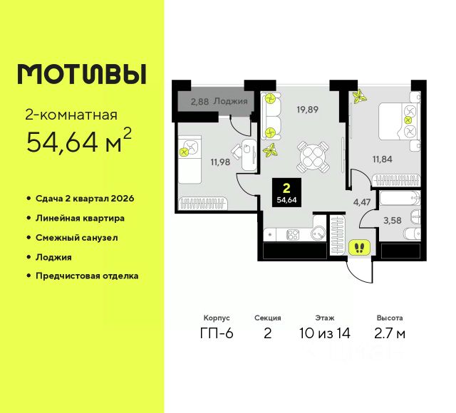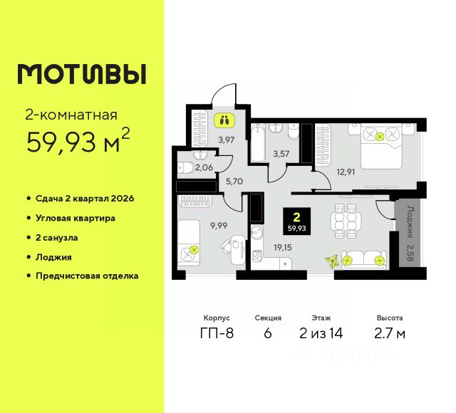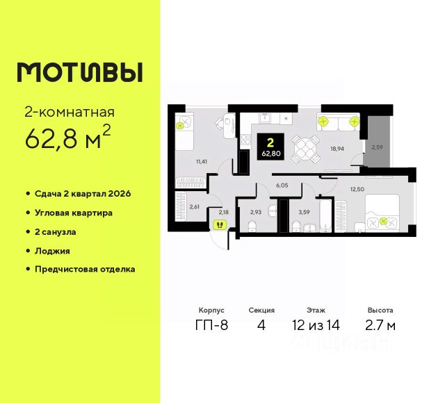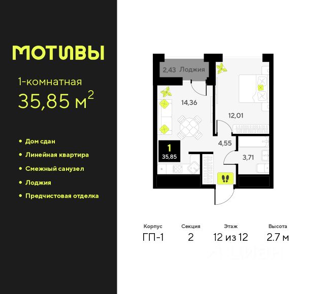 Однокомнатная квартира с предчистовой отделкой в ЖК "Мотивы" на 12 этаже. Общая площадь: 36.95 кв.м., жилая: 12.61 кв.м., площадь просторной кухни-столовой: 14.86 кв.м. Все окна выходят на одну сторону. В квартире одна лоджия, один совмещенный санузел. Высота потолков 2.7 м. Квартира будет сдаваться с предчистовой отделкой White Box: выровнены и оштукатурены стены, проведено электричество и отопление, установлены радиаторы. Вы также можете приобрести квартиру с ремонтом от застройщика, представленным в трех цветовых решениях Scandi, Wood и Coffee и включающим ламинат, обои под покраску, двери, натяжной потолок и санузел с сантехникой. При желании вы можете заказать отделку под ключ, варианты возможных решений представлены в альбоме фотографий. Дом монолитный, двухподъездный, переменной этажности, от 12 до 14 этажей. Квартира находится во 2-й секции высотой 12 этажей в корпусе ГП-1. На этаже 12 квартир. В подъезде 1 пассажирский и 1 грузовой лифт. На сегодняшний день строительство окончено, дом сдан в 4 квартале 2024 года. Оформление сделки по договору купли-продажи. Закрытая от автомобилей территория, безопасный двор и камеры видеонаблюдения - гаранты вашего спокойствия. Квартал будет располагать богатой инфраструктурой: на первых этажах разместятся магазины, пекарни, кофейни, пункты выдачи, аптеки, детские центры, цветочные салоны и многое другое, что сделает жизнь поистине комфортной. Рядом находится парк общей площадью почти 5000 м², в котором располагаются локации для игр и отдыха жителей, здесь можно совершить утреннюю пробежку или прогуляться после рабочего дня. В парке есть зона воркаута с тренажерами для взрослых, игровые комплексы с горками и канатный комплекс для детей разных возрастов, качели и лавочки для отдыха, площадки для командных видов спорта и для панна-футбола. В ЖК "Мотивы" всё продумано до мелочей: светлые холлы входных групп, оформленные в едином стиле, просторные колясочные, лапомойки для питомцев. На территории комплекса находятся 2 8-ми этажных паркинга и более 1000 м/м на открытой парковке. Жилой комплекс находится в одном из экологически благоприятных районов Тюмени, недалеко от Плехановского бора. При этом до центра города можно добраться за 15 минут, а до международного аэропорта Рощино за 13 минут. Окончание строительства: ГП 1, 2, 3, 4 сдача до конца 2024 года, ГП 6, 7, 8 сдача 2 квартал 2026 года. #24eol8