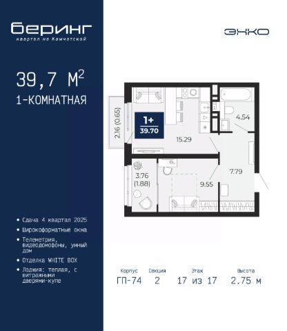 Продается 1-комн. квартира в ЖК "Беринг" на 17 этаже. Квартира без отделки, новый владелец может сделать ремонт по своему дизайн-проекту. Общая площадь: 39.7 кв.м., жилая: 9.55 кв.м., площадь просторной кухни-столовой: 15.29 кв.м. Все окна выходят на одну сторону. В квартире один балкон и одна лоджия, один совмещенный санузел. Высота потолков 2.75 м. Дом монолитный, многоподъездный, переменной этажности, от 9 до 21 этажей. Квартира находится во 2-й секции высотой 17 этажей в корпусе ГП-74. На этаже 7 квартир. В подъезде 1 пассажирский и 1 грузовой лифт. Окончание строительства - 4 квартал 2025 года. Оформление сделки по договору долевого участия. Подобно знаменитому исследователю, мы чувствуем себя первооткрывателями этой локации. Хотим показать новую суть места, сформировать для вас жизненный опыт, которого ещё не было. Беринг — район зелёного цвета. Беринг — район, который откроется вам с другой стороны. Впечатлит новым уровнем комфорта и качеством жизни. Беринг — открытие на карте города. Первый квартал расположен в районе Тура, в границах улиц: Камчатская Западносибирская Энтузиастов. Вокруг уже есть всё для того, чтобы ежедневная рутина была лишь частью жизни и не доставляла дискомфорта. Школы и детские сады, магазины и аптеки, поликлиника, места для семейного отдыха, пеших и велопрогулок, и даже рыбалки. Масштабное озеленение дворов — визитная карточка ЭНКО и ваш оазис спокойствия, чтобы отвлечься от повседневности. Раскидистые деревья, кустарники, травы и цветы — осталось остановиться, вдохнуть и расслабиться, глядя на эту природную красоту. Стилистика подъездов продолжает концепцию Беринга, вдохновлённого Камчаткой: сдержанный, но при этом впечатляющий дизайн соседствует с удобством и функциональностью. #Z3s6U2