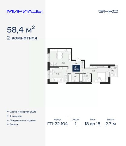 Продается двухкомнатная квартира с предчистовой отделкой в ЖК "Мириады" на 18 этаже. Общая площадь: 58.4 кв.м., жилая: 25.6 кв.м., площадь просторной кухни-столовой: 16.3 кв.м. Квартира без проходных комнат, окна выходят нa три cтopoны дома. В квартире один балкон, два совмещенных санузла. Высота потолков 2.7 м. Дом монолитный, двухподъездный, переменной этажности, от 14 до 18 этажей. Квартира находится в 1-й секции высотой 18 этажей в корпусе ГП-72.104. На этаже 6 квартир. В подъезде 1 пассажирский и 1 грузовой лифт. Окончание строительства - 4 квартал 2025 года. Оформление сделки по договору долевого участия. Вселенная бесконечных историй. Ранее невиданный Тюмени масштаб: территория 240 гектаров и 1 650 000 м² застройки. Мириады это город масштабных перемен и больших возможностей. Город зеленых рощ и зеркальных озер. Город для работы, учебы и развлечений. Город для детей и их родителей. Город для всех и каждого. Проект расположен в районе Мыс рядом с ТРЦ "Тюмень Сити Молл" в границах улицы Тимофея Чаркова, Тобольского тракта и объездной дороги. Срок полного освоения территории - до 2034 года. #Z6B4Vl Продам 1-комнатную квартиру в новостройке без отделки в Тобольске.