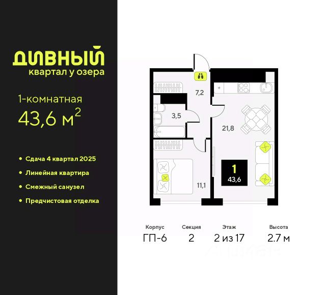 Дом монолитный, двухподъездный, высотой 11 этажей. Апартаменты находятся в 1-й секции в корпусе 2. На этаже 4 квартиры. В подъезде 2 пассажирских лифта. На сегодняшний день строительство завершено, дом сдан во 2 квартале 2021 года. Оформление сделки по договору купли-продажи.