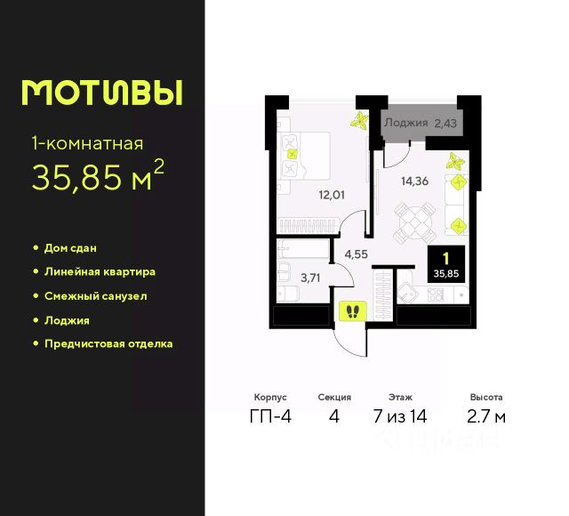 Продается 1-комн. квартира с предчистовой отделкой в ЖК "Мотивы" на 7 этаже. Общая площадь: 35.85 кв.м., жилая: 12.01 кв.м., площадь просторной кухни-столовой: 14.36 кв.м. Все окна выходят на одну сторону. В квартире одна лоджия, один совмещенный санузел. Высота потолков 2.7 м.