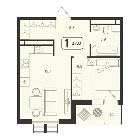 Планировка точная и разумная — как хороший мотив: просторная кухнягостиная 19,7 м², где удобно собирать гостей и одновременно готовить, две правильной формы комнаты 12,3 и 11,3 м² — одна из них легко становится мастерспальней, другая — детской или камерным кабинетом. Два санузла (приблизительно 3,8 и 3,5 м²) — редкая приятность в городской квартире; лоджия/балкон 3,9 м² даёт дополнительную интимную террасунишу для растений и утра с чашкой кофе. Прихожие и ниши продуманы для хранения — место для аккуратного гардероба и техники, ничего не мешает глазу и движению. Планировка по сути — "игра на контрастах": простор для общения и уют для уединения, всё по правилам современной жизни.