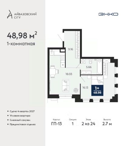Просторная однокомнатная квартира с предчистовой отделкой в ЖК "Прео" на 2 этаже. Общая площадь: 43.8 кв.м., жилая: 15.08 кв.м., площадь просторной кухни-столовой: 14.08 кв.м. Все окна выходят на одну сторону. В квартире один балкон, один совмещенный санузел. Высота потолков 2.7 м.